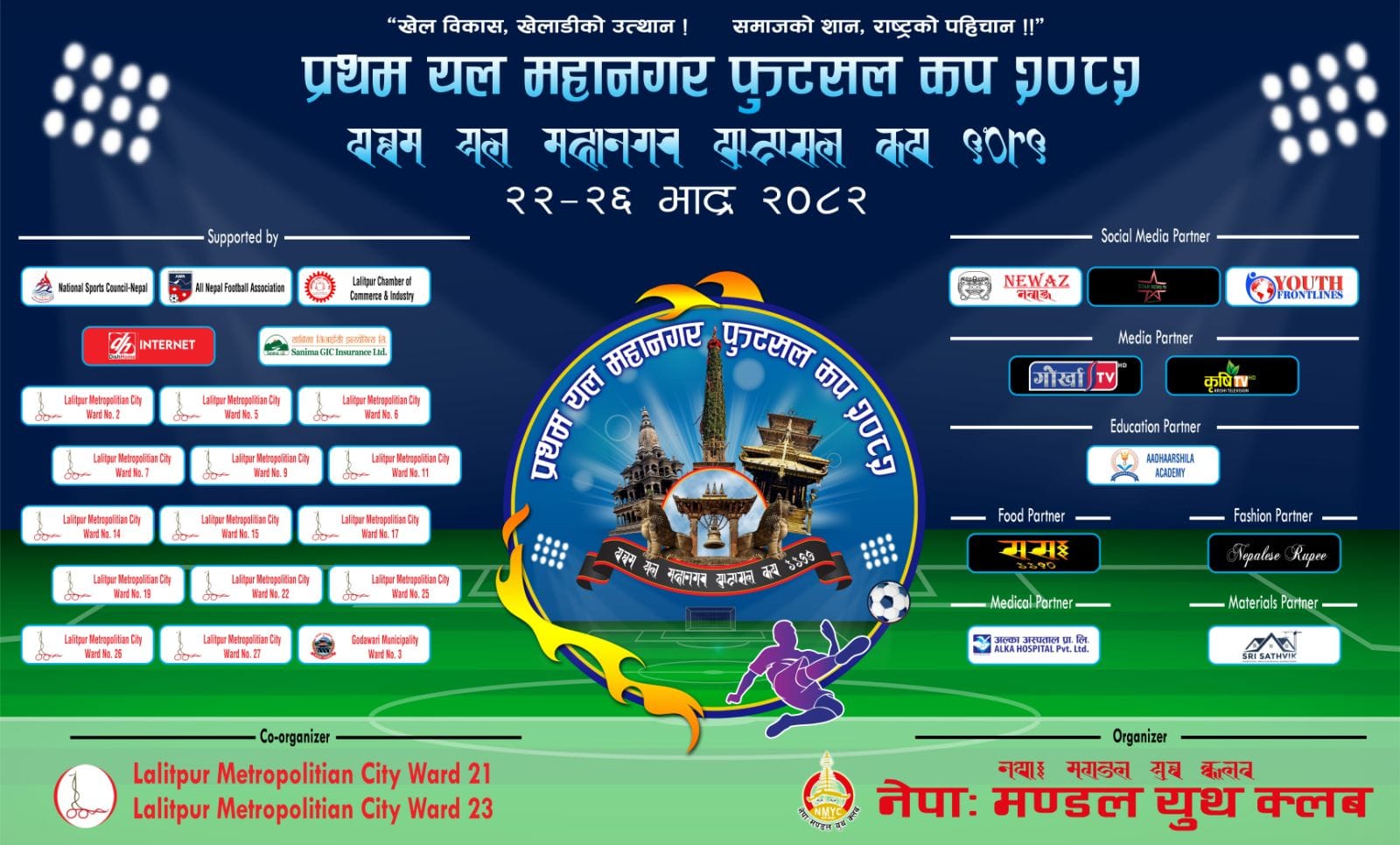 ललितपुर, असोज १२“खेल विकास, खेलाडीको उत्थान! समाजको शान, राष्ट्रको पहिचान!!” भन्ने नारासहित आयोजना गरिएको प्रथम यल महानगर फुटसल कप–२०८२ भव्य रूपमा सम्पन्न भएको छ। नेपाल: मण्डल युथ क्लबको आयोजनामा तथा ललितपुर महानगरपालिका वडा नं. २१ र २३ को सह–आयोजनामा सञ्चालन भएको प्रतियोगिता भाद्र २२ गतेदेखि सुरु भएको थियो।